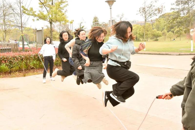 下午一点,活动在老师们欢快的跳绳项目中展开。跳绳过程中,老师们相互协调合作,每位教师随着整齐划一的节拍起跳,紧随绳子的节奏。一时间,呐喊声和欢笑声交织在一起,整个花田都洋溢着欢快的气氛。结束后,老师们一同去山坡欣赏美景,欢笑声与花香交织在一起,汇成了春天特有的魅力。