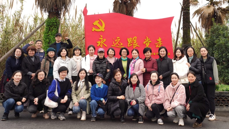 老师们将采摘好的草莓安置于大巴座位上,一行人沿着雅金村的观光小道开始踏青游春。雅金村是浙中新农村建设的基地之一,2017年入选浙江省首批3A级景区村庄名单,又是金华市浙中生态廊道建设的一个节点。所以,中国自十八大以来开展新农村建设,保护与发展乡村自然生态与人文生态的规划,在雅金村得到了非常到位的实践。可以看到,三月的春天,本即草木茵茵的时节,但雅金的春绿,裹挟着草莓的芬香,更添一段清甜。其中一段廊道,左侧半倚青草坡,右侧紧靠一片绿草地,草地连起一丛丛杨柳,杨柳依偎在春潮正涨的江畔,层层弥漫的葱葱郁郁,给大家留下了深刻印象。这一路亦行经不少文化景点,如雅金村文化礼堂,拥有400多年历史的古建筑永慕堂,据称是贾谊后裔的贾氏石牌坊与贾氏宗祠,还有古老的平安小巷等。雨后的乡间小路,风景宜人,吸引好几位女教师在平安小巷中,驻足留影。在中途经沿廊道的一段路坡上,以及一面写着“永远跟党走”的纪念墙前面,大家兴致勃勃地合影留念。