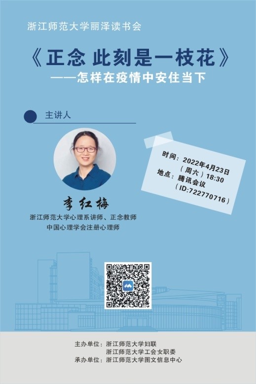 今年的读书节正值金华疫情形势较为严峻的时期,教职工的工作生活状态受到了较为明显的干扰和影响,需要作出调整。校妇联、校工会和图文信息中心为了让师生在疫情期间管理好情绪,重新找回平静、专注、清明的自己,学校丽泽读书会在世界读书日——4月23日这天晚上,在腾讯会议开展了线上读书活动。活动邀请浙江师范大学心理系讲师、正念教师、中国心理学会注册心理师李红梅老师以“怎样在疫情中安住当下”为主题,带领我们共读正念减压之父乔.卡巴金的经典著作《正念 此刻是一枝花》。