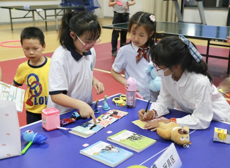 教工家长陆陆续续带着孩子们走来,小朋友们拎着装满物品的小袋子,欢喜雀跃地向自己的摊位走去。小朋友们此刻就像一个个真正的小商人,用心装扮自己的儿童小摊,一笔一划地在标签上标出每一份物品的价格。小朋友眨巴眨巴眼睛,或等待感兴趣的顾客,或主动出击推销自己的商品,家长在一旁引导着孩子进行物品交易,场面热闹温馨,分享和交易带来的快乐充盈了整个教工小家。