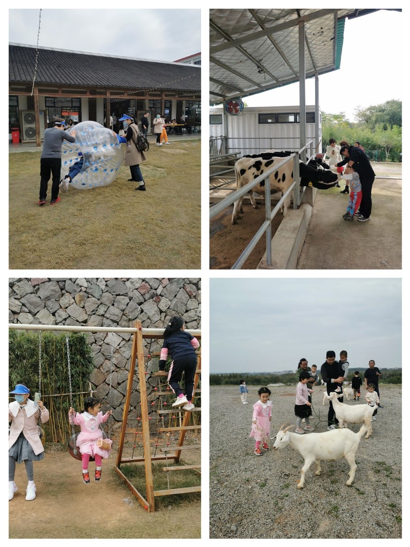 离开美丽的九峰山,品尝过美味的汤溪土菜后,大家又启程前往九峰牧场。九峰牧场视野开阔,大片的草坪让人忍不住拍照打卡。温顺的奶牛和山羊等动物吸引了孩子们的注意,投喂过程趣味横生。午后的秋风很温柔,帐篷营地热闹非凡,孩子们在荡秋千、玩卡丁车……无论是大人们还是孩子们都沉浸其中,一幅人与自然和谐共处的诗意画卷。