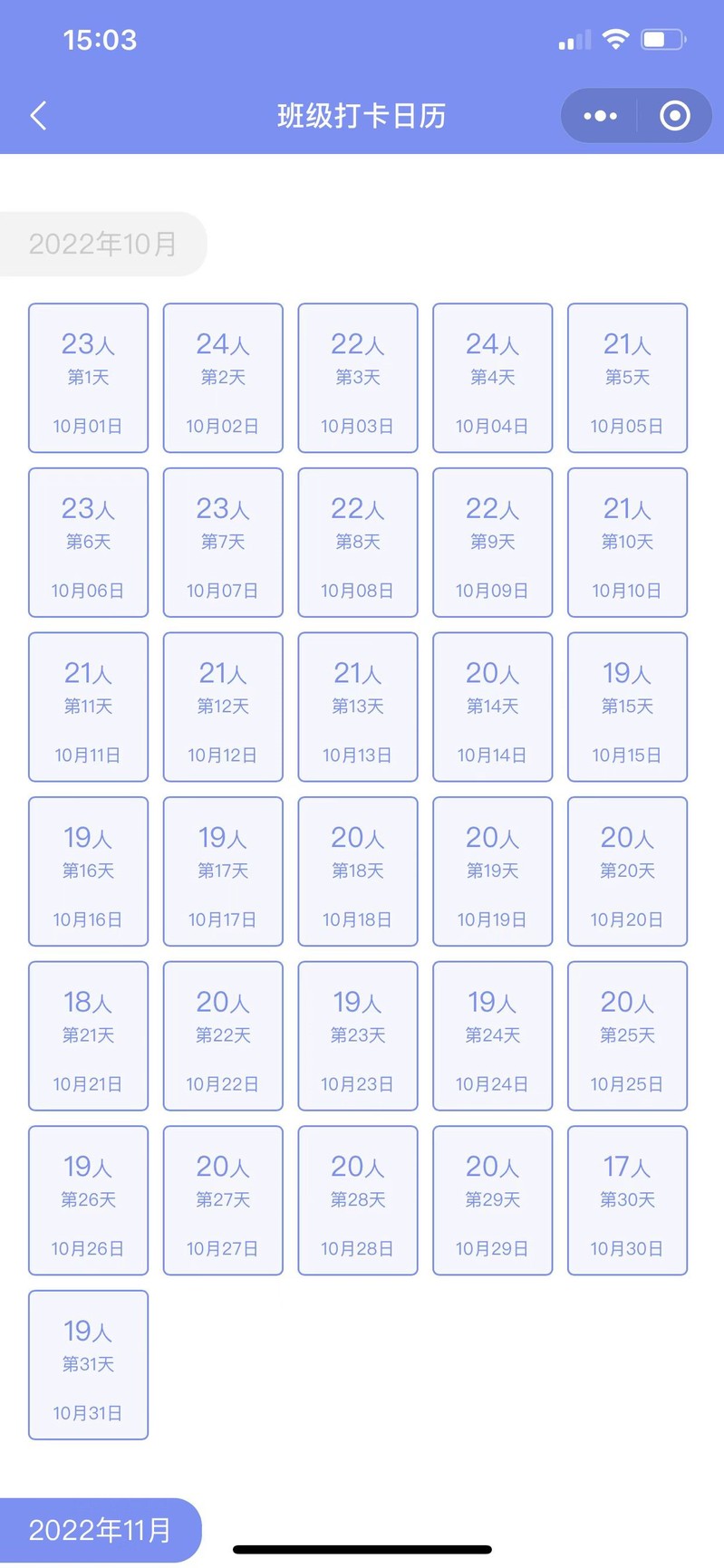 为进一步推动我院教职工增强体质,磨炼意志,学院工会从十月份开始推出了“每日健身走”锻炼活动。活动的方式是:采用教职工自由走(微信或者支付宝运动计数)每日6000步为达标步数。采用“班小二”打卡统计,每天晚上上报当天的运动步数。若参加其他锻炼活动(例如打乒乓球、羽毛球、气排球、网球等)半小时以上,也视为当日运动达标。如一个月内有25天运动达标,院工会给予一定的奖励。“每日健身走”活动开展一个多月以来,大家都养成了低碳出行的好习惯,崇尚运动、健康向上的氛围更加浓厚了,精神面貌有了极大提升。