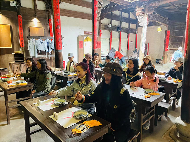 穿过古朴街巷,走过烟火人家,老师们来到了抟云塔面前。抟云塔建于明代隆庆元年,玉华叶氏先祖为镇脉气、兴文风,以土堆法砖砌之术而建。平观,整个塔身呈平面正六边形,檐角微挑,腰檐内倾。底座三道券门,二层起各有三个错位而开的发券窗洞。仰视,塔顶如笔锋,扶摇而上。岁月有痕,斑斑驳驳,抟云塔历四百年沧桑而英姿勃立,不禁让人心生敬意。旁边的文昌阁,续建于清朝同治年间,是二重檐歇山顶式,两层土木楼宇。从清朝私塾到国学馆,玉华叶氏秉承勤取知识、培植文风的书院学规,践行耕读传家理念。老师们饶有兴致齐聚一堂,运笔写字,观叶氏后人学童的人生第一“礼”。