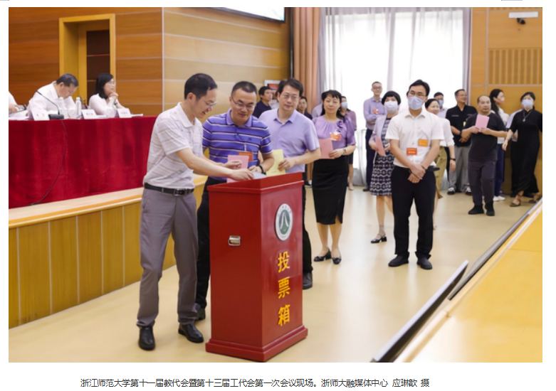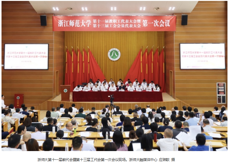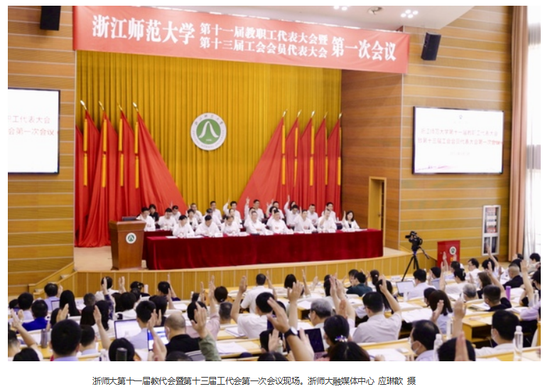 6月7日,浙江师范大学第十一届教代会暨第十三届工代会第一次会议在行政中心报告厅举行。浙江省总工会二级巡视员、省教育工会主席王玉庆,金华市总工会党组书记、 副主席施文臻应邀出席会议,浙师大党委书记郑孟状发表讲话,校长蒋云良作学校工作报告,党委副书记邵国平、朱坚先后主持会议。