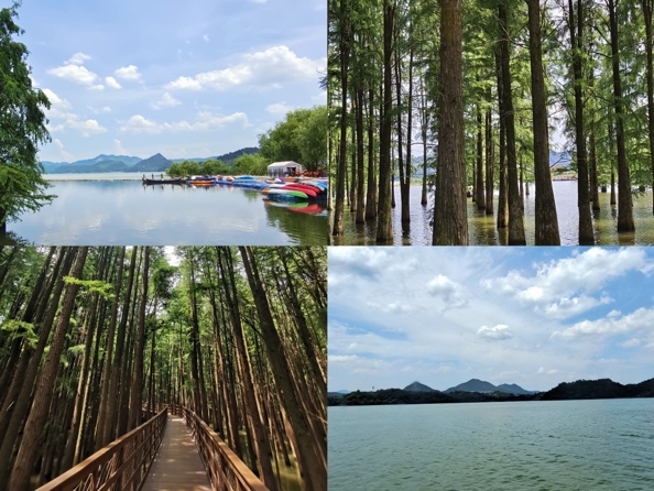 环游临安青山湖。青山湖有着“树在水中长,船在林中行,鸟在枝头鸣,人在画中走”的绝美意境。老师们迎着阳光,走进树林,漫步于浮桥、森林中,美景交融在眼前,享受这一刻的清凉。