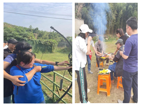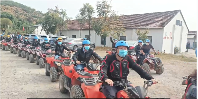 营地的明星项目是全地形越野车,集惊险、刺激、挑战、野性于一体的野外体验。这里是山地与泥潭的组合,老师们抛却平日温文尔雅的矜持状态,兴致勃勃地穿上机车服,尽情地在山野间自由驰骋,体验速度与激情的快乐。营地还有射箭、轰趴、无动力乐园、萌宠乐园等其他休闲项目。大家找到自己喜欢的项目,玩的不亦乐乎。有的在比拼射箭技巧,有的在轰趴组队玩桌游,有的带着娃娃们在喂驴马孔雀......