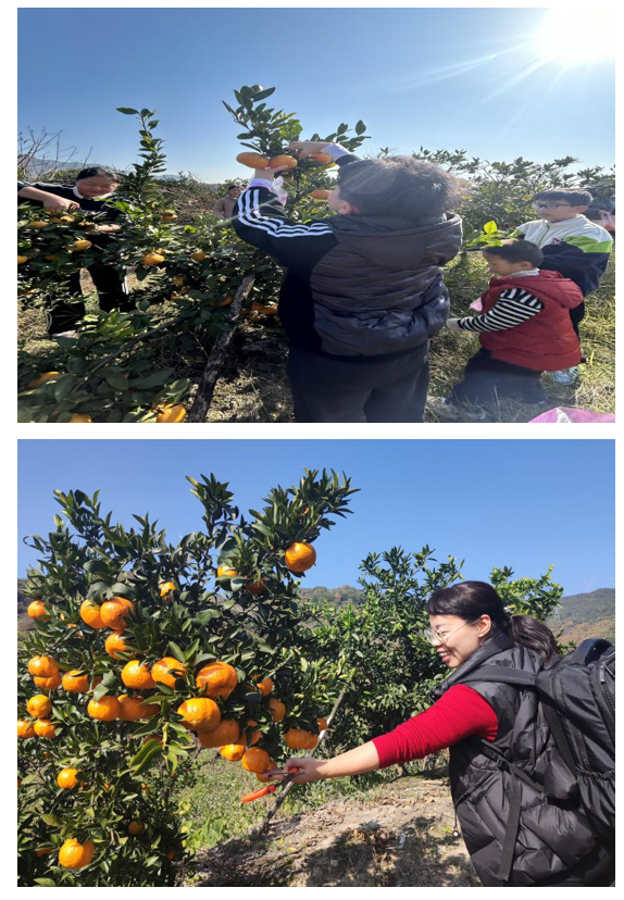 上午一行人到东叶村村头采摘橘子。一地金黄的橘子诱人地挂在枝头,大家边吃变品。“这颗树上的橘子特别甜!”人群中不知是谁喊了一声,大家一拥而上,大人小孩都兴致勃勃,仿佛都回到了无忧无虑的童年,沉浸在收获和分享的喜悦中。