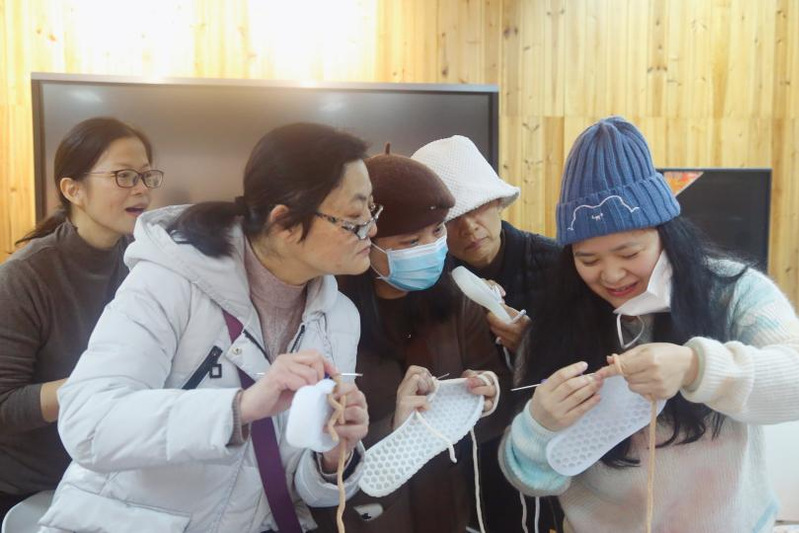 活动现场,参与女教工们围坐在一起,老师主动示范、耐心讲授,将针织手法及编织窍门毫无保留地传授给在场参与者,编织“小白”边看边学边问,认真编织,气氛热烈又温馨十足。