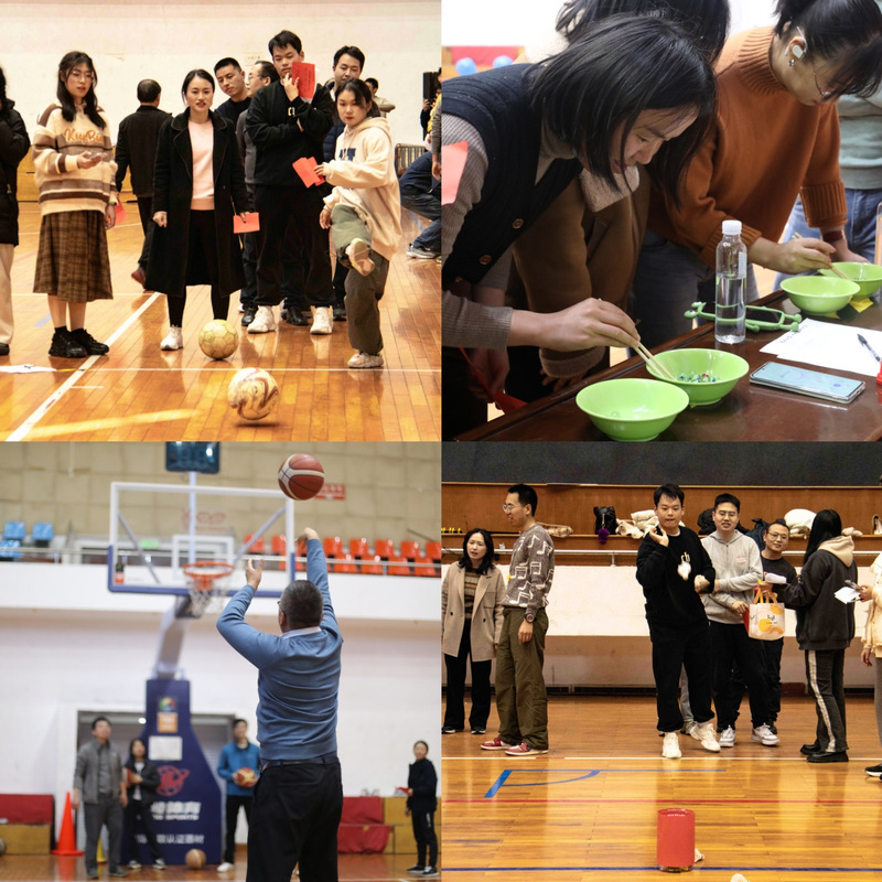 个人项目有“捷足先登”“迎‘篮’而上”“眼明手快”“一‘掷’前进”等,形式多样,趣味横生。捷足先登:划过木地板上金色的光影,足球向着球门飞奔而去。短短10m的路程,聚焦全场的紧张与期待。迎“篮”而上:篮球撞击地板后弹起,颇具节奏感和力量感,为场上飞驰的身影配以绝佳伴奏。全速绕过设置的障碍,双眼锁定篮筐,轻盈一跃而起,行云流水的动作和应声入框的命中博得满场喝彩。眼明手快:玻璃弹珠晶莹剔透,互相推挤碰撞着发出清脆声响。一双筷子两只碗,一碗弹珠一群人,教师们把控握筷力度,调整夹取方式,屏气凝神夹起,小心翼翼转移。一“掷”前进:微眯眼瞄准投壶,前后对准跃跃欲试。计时员按下秒表的瞬间,一抹洁白划过半空,描画出一道弧度完美的抛物线,不偏不倚着陆边沿,弹入投壶。一方小小投壶,满载投中时的跃动与欢喜。