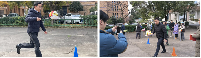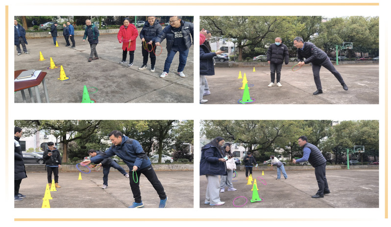 接下来是趣味套圈,参赛队伍手持不同大小的圆环,迎着时间的压力,迅速将圈套在地面的圆锥筒上。这一项目考验了选手的手眼协调能力和反应速度,现场笑声此起彼伏。即便有的圈在半空中旋转,教职工们也展现出了出色的技巧,为比赛增色不少。