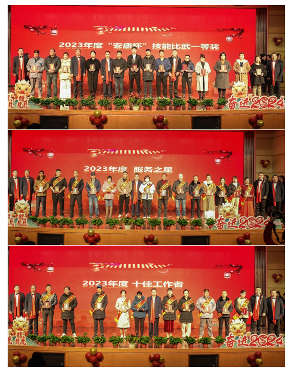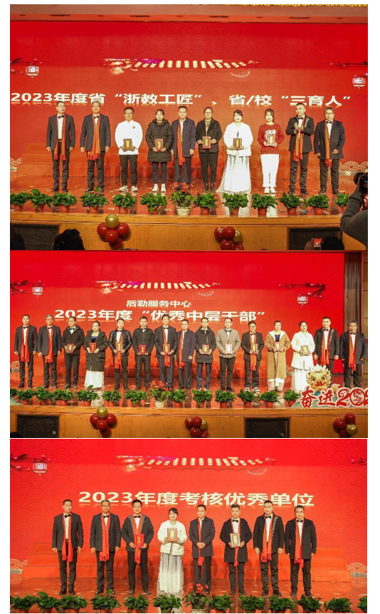 春华秋实,一分耕耘一分收获。在过去的一年,后勤员工脚踏实地、克尽厥职,努力用品质服务和坚实保障助力了学校高水平大学建设,响应了师生对于美好校园生活的向往。一年来,在平凡的后勤岗位上涌现出一批批做出了不平凡业绩的先进集体和个人。会上,全体领导班子成员向2023年度“安康杯”技能比武一等奖获得者、服务之星、十佳工作者,浙教工匠、省“三育人”、校“三育人”先进个人,优秀中层干部、考核优秀单位等获奖人员和集体颁发了荣誉证书。