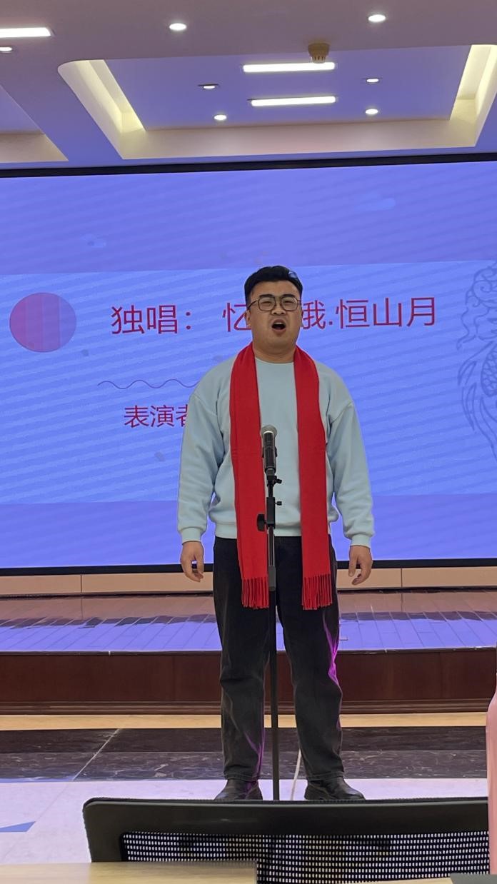 合唱团的教练张明浩老师带来了一首歌曲《忆秦山·恒山月》,这是范曾诗词中国艺术歌曲声乐作品集中的一首作品,非常具有中国古典雅乐风格。张老师专业的演唱时而细腻,时而浑厚开阔,呈现出别具一格的丰富意涵。