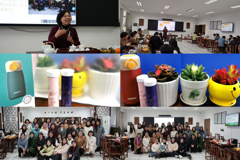 淡中有味茶偏好,香茗一盏情更真。马美爱老师从理论和实践两个方面带大家体验茶艺。理论上,简要介绍了“茶为国饮”的内涵、六大基本茶类和茶叶的健康功效,着重讲解一杯好喝的茶汤是茶、水、器、人的和谐,冲泡时要注重把握茶叶用量、冲泡水温和冲泡的时间。实践上以“客来敬茶”入手,斟上福鼎老白茶的茶汤引导大家闻香、观色、尝味;示范讲解了备具、布具的秩序、方法和冲泡的流程;并准备了绿茶、红茶和乌龙茶供大家体验练习,引导大家感受和操作。愉快而又投入的体验结束后,为大家斟上陈皮普洱茶汤,并借黑茶在时光中转化的特点为老师们送上青春常驻的祝福。