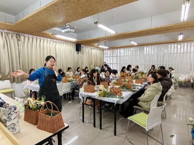 当天下午,女神们齐聚一堂,笑靥如花。活动现场更是春意满满,和谐温馨。首先由邀请到的专业花艺老师为女神们讲解了插花的知识与技巧,教大家色彩搭配以及如何定制造型。花艺老师提醒插花需要遮住花泥,高度不能超过花篮提手,花根斜剪插入花泥2-3cm。