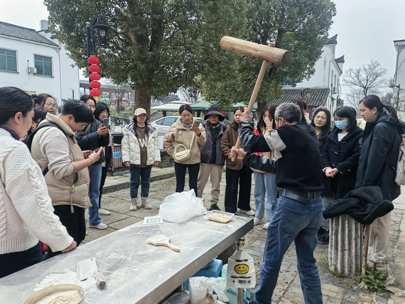 午饭后,大家参与了打麻糍的活动。麻糍是岩头村的传统美食,制作过程不仅考验力气,还需要技巧。在师傅的指导下,老师们亲手捶打糯米,过程中笑声不断,大家都感受到了其中的乐趣和成就感。成品软糯香甜,每一个人都品尝到了自己劳动的成果。