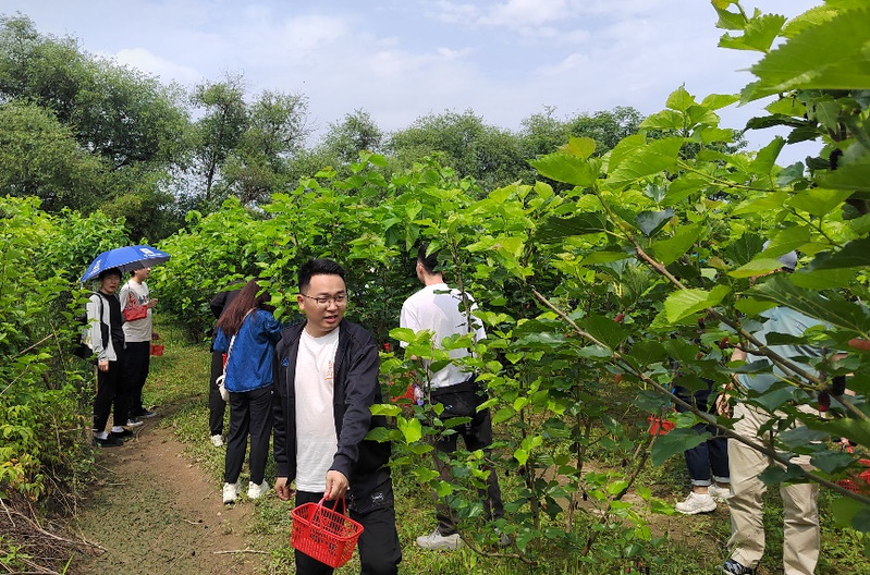 午后,教职工们来到了桑葚采摘园。只见园内桑树成林,绿叶掩映下,一颗颗紫红色的桑葚挂满枝头,散发着诱人的香气。采摘的过程中大家相互交谈、互帮互助,不时爆发出爽朗的笑声,体验丰收的喜悦。