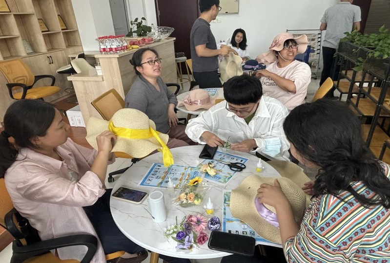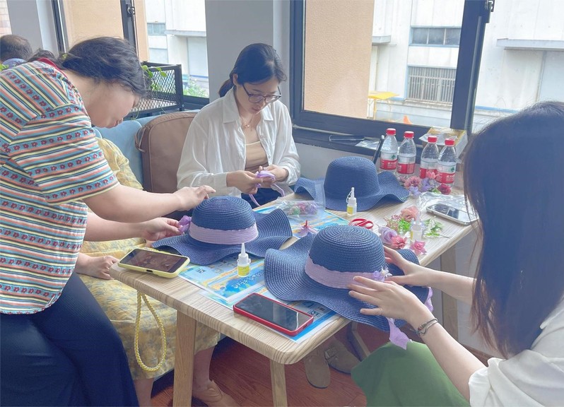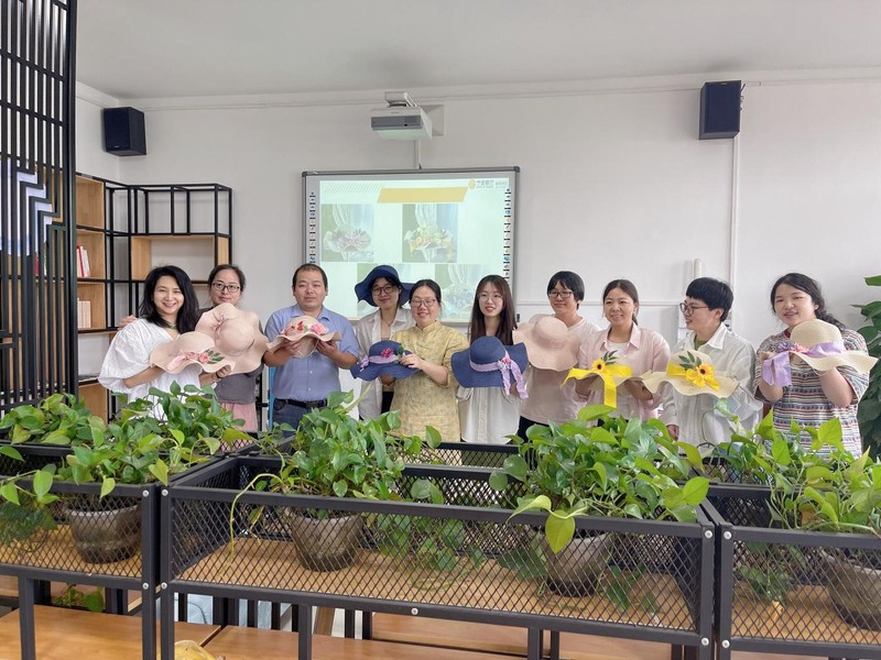桌上早已摆放好多种颜色的草帽和各类装饰材料,教职工们可以按照自己的喜好自由选择。老师们拿起剪刀和胶水,不时低声讨论自己对草帽的构思和布局,他们挑选着鲜艳的丝带和花朵,将其巧妙地插在草帽的边缘或顶部。在老师们的巧手下,草帽变得生机勃勃,精美绚丽。