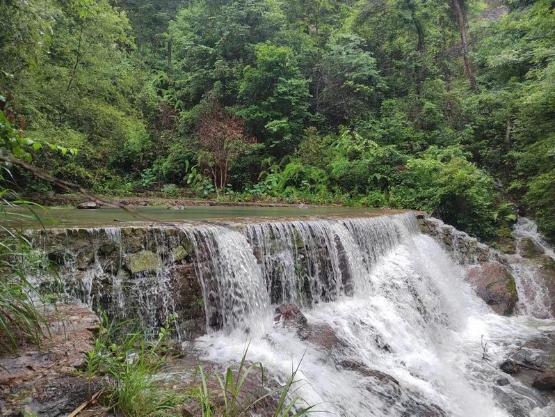 雨一直热情的陪伴着,路面又窄又滑,且积有较深的水,碰到难走的坎儿,大伙儿相互搭把手照应着。即使是在雨中,山路也不忘和我们开个玩笑,走着走着,忽然就没了路,正犹疑间,忽见边上探出个熟悉的脑袋来,告知找到了新路,于是惊喜的大呼小叫着相告,那种来自团队的友爱和集体的温暖,时时令人感动着、愉悦着。虽然不消说都湿了鞋,在瀑布的飞珠溅玉和雨幕的双料浇灌下湿了身,但我们依旧兴致盎然,在此时的风里寻一分快然恣肆,在此地的雨中听一曲自然之音,开心无比。在经过一道叫“盛世龙门”之门时,有会员调侃说,今日我们既经历风雨,又过“盛世龙门”,往后人生尽是彩虹。