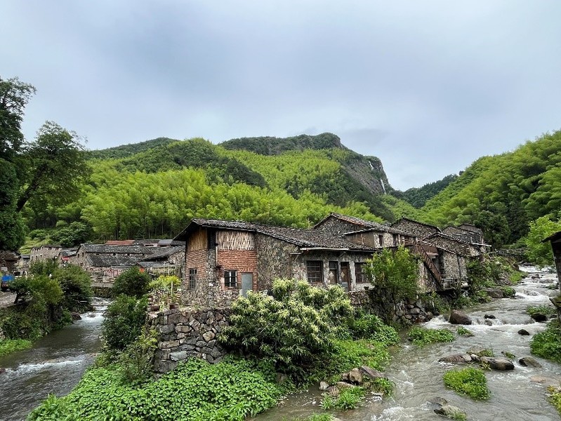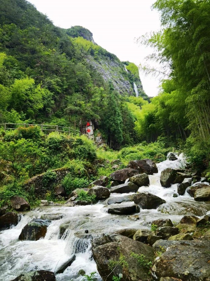穿越村落的普通岭古道,是古时婺州通往台州的交通要道,古道由石块铺砌,两旁茂林修竹,沿石阶而上,可仰望百丈岩,我们的运气相当不错,近期雨水充足,见识了百丈瀑布从悬崖峭壁飞流直下的磅礴气势。