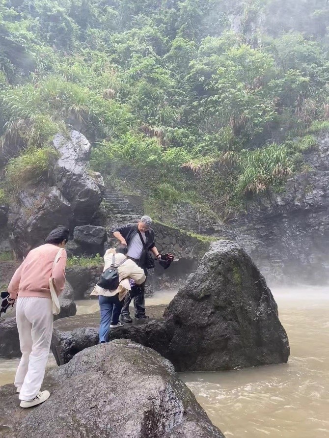 相较于上午的冒雨集中行,下午的行程就比较轻松个性。有的干脆择一石凳坐下,聊着笑着,自带松弛感。有的往村里走走看看,到农户家中,与村民唠唠嗑,来个深入游;有的则结伴登普通岭,一边欣赏空山新雨的自然风光,一边完成今日份锻炼的小心思。拍照,自然是永恒的主题,会员们尽情互拍,上演“你在桥上拍风景,拍风景的人在别处拍你”之摄影大赛,于是就有了那一个个看似不经意的造型、一个个微表情,人人都是天生的表演艺术家,人人都是摄影大咖,不出意外的话,很快你就能在群里免费欣赏到纷至沓来的大片。再或者,什么也不做,就在被雨和空气清洗的干干净净地石阶上随意一坐,只需带上眼睛,不说话,就十分美好。