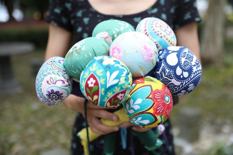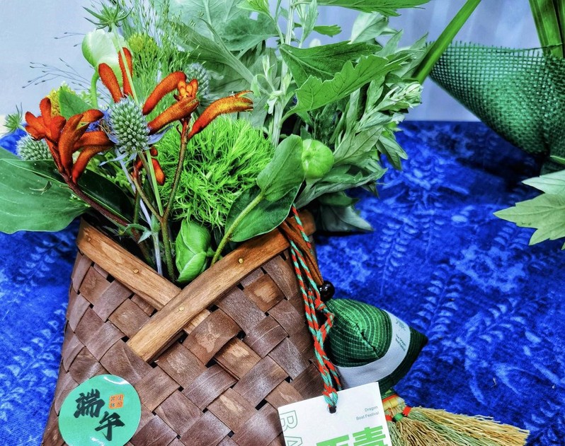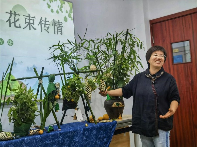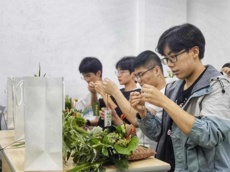 学生社区工会组织员工与学生一起制作艾草花束。艾草花束蕴含驱蚊辟邪、纯洁健康、吉祥祈福之意。工作人员为每个人分发艾草、菖蒲、香包、包装纸、绑带等原材料。大家一起有条不紊地按照老师的步骤修剪艾草和菖蒲,细致地将它们摆放在包装纸上,再捆扎在一起,系上装饰丝带。不一会儿,一束束造型独特的花束就完成了,散发出清新的艾草香气。大家举着艾草花束,互道一声“端午安康”。