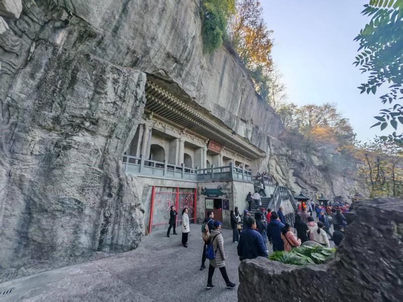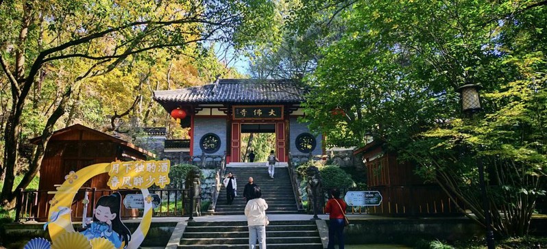 首站目的地是被誉为 “石城古刹” 的大佛寺景区。步入大佛寺,千年禅意扑面而来。依山而凿的石弥勒像庄严肃穆,高逾十六米,为南朝齐梁年间,僧护、僧俶、僧祐三代匠人耗时三十余载,以一锤一凿铸就,佛像面容慈悲,历经十余朝代风雨依然栩栩如生。驻足像前,聆听讲述,庄严与敬意自心底油然而生。般若谷流水潺潺,摩崖石刻映天光,大家轻声诵读石壁上的心经,感受文字与自然交融的宁静;木化石林内,亿年树化玉静静伫立,见证沧海桑田的变迁。教职工互相帮忙拍照留念,沿途不时传来阵阵笑语,融洽氛围在山水间悄然蔓延。