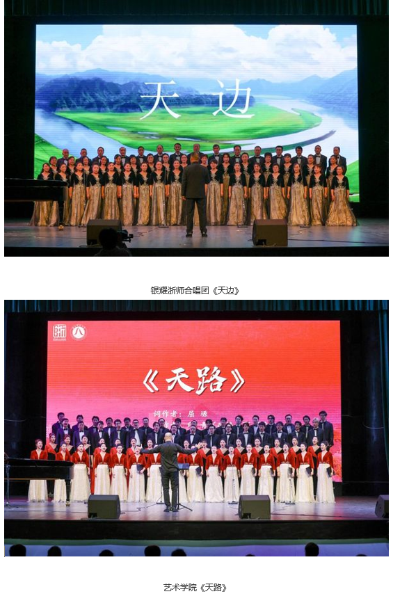 体育学院身着蒙古族特有服饰演绎《蒙古人》,由学校退休教职工组成的银耀浙师合唱团作为特邀团队,以一首《天边》传递对母校七十载岁月的深情,合唱表演落幕之际,艺术学院特别献上表演曲目《天路》,表达了浙师人砥砺前行、勇攀高峰的不懈追求。