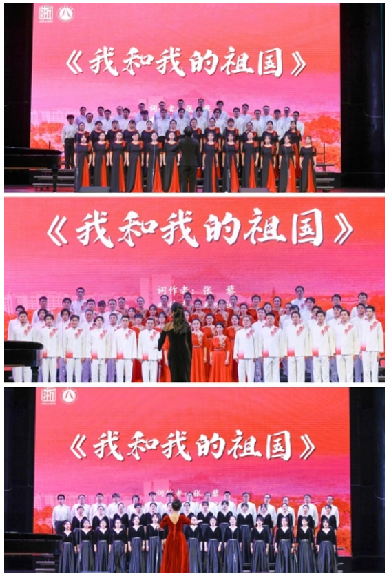 杭校区管委会、儿童教育学院与幼教集团携手演唱《天耀中华》,法学院、图文中心、马克思学院、设计学院四支队伍以不同的演绎呈现《祖国不会忘记》,化材学院、生命学院、计算机学院三支队伍引吭高唱《我和我的祖国》,行知学院与数学学院两支队伍带来《灯火里的中国》,表达了对浙师大教职工和国家建设者的敬意与颂扬。