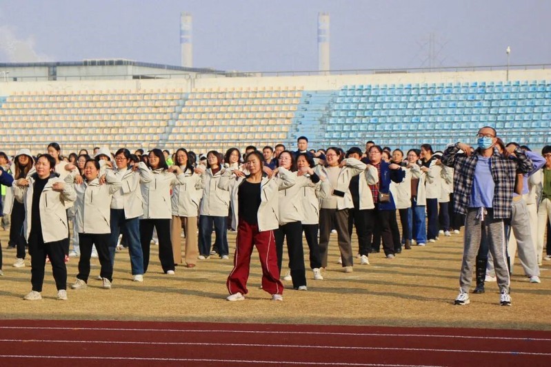活动开始前,教工们齐聚起点,在体育教师的带领下,共同进行热身准备。大家跟随节奏舒展肢体、活动关节,现场气氛轻松活跃,为即将开始的奔跑做好了充分准备。