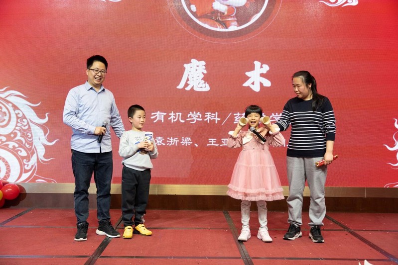 “化材二代”萌娃们的精彩亮相更是萌翻全场。物化学科詹才宏老师与小朋友带来的歌舞《小风筝》温情满满;含氟所与药学学科的王芳芳老师携爱女带来的歌曲《Zoo》充满童趣,瞬间将现场变成了欢乐的动物园。特别惊喜来自有机学科的“小嘉宾”带来的街舞《青春修炼手册》,小小年纪台风稳健、舞技精湛,赢得了满堂喝彩。