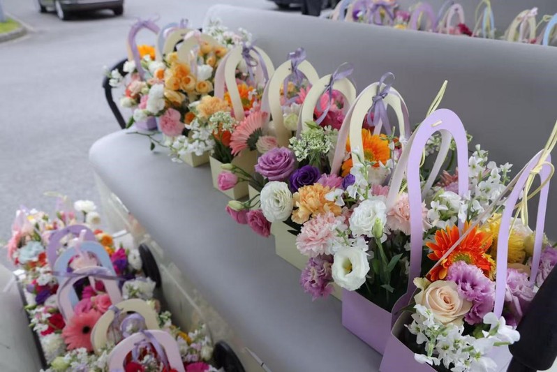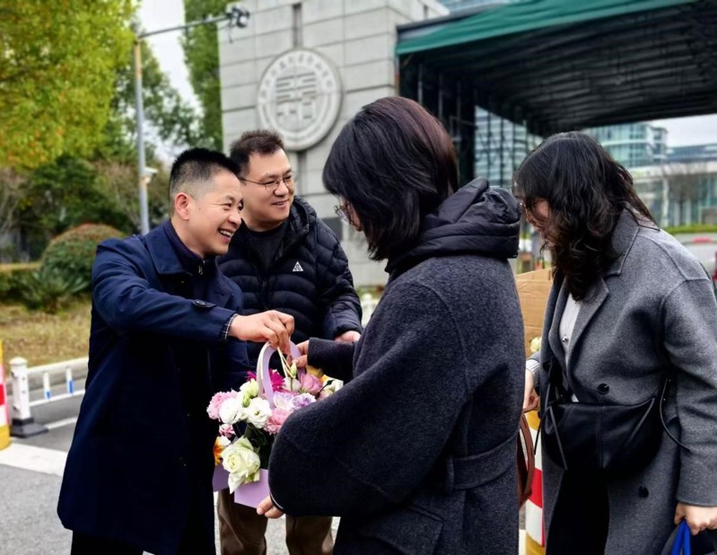 7时50分左右,教工们陆续乘坐校车抵达学校。车门开启,映入眼帘的不仅是熟悉的校园景象,更有学院工会精心准备的鲜花和工作人员的笑脸。学院领导和工会代表早已等候在停车点,依次向每位女教工送上鲜花,一句句"女神节快乐"的问候,让大家感受到浓浓的暖意。