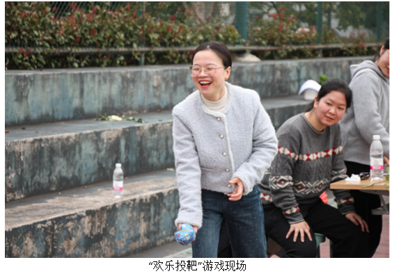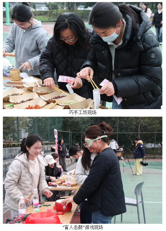 在巧手工坊内,中药香囊制作区香气袅袅。女教职工们精心挑选艾草、薄荷、迷迭香、苦丁等各味中药材,细细研磨,制成安神、助眠、驱虫等各类香囊,传递着对健康与幸福的美好祈愿。知识灯谜会前人头攒动,大家或凝神思索,或热烈讨论,猜中者的欢呼声此起彼伏。不远处的“盲人击鼓”与“欢乐投靶”环节同样充满欢声笑语,蒙眼转圈后的踉跄步伐,以及沙包精准落靶的瞬间喝彩,让整个场地洋溢着轻松愉悦的节日氛围。